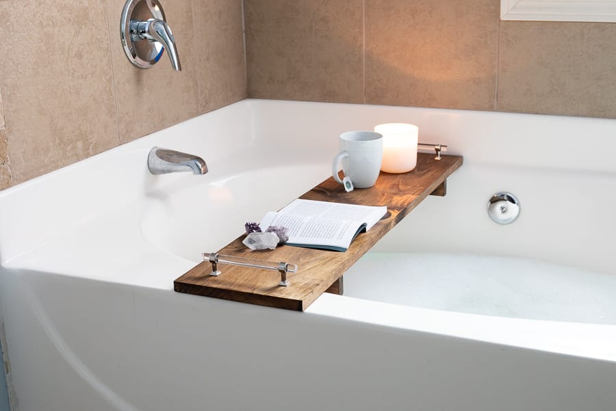 This DIY bathtub tray is an easy beginner woodworking project and a great addition to any bathroom. Relax and pamper yourself! This can be customized according to the width of your bathtub.