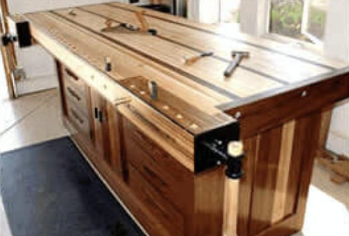 This rugged and elegant workbench offers superior stability, built-in storage, and versatile clamping options for precision woodworking.