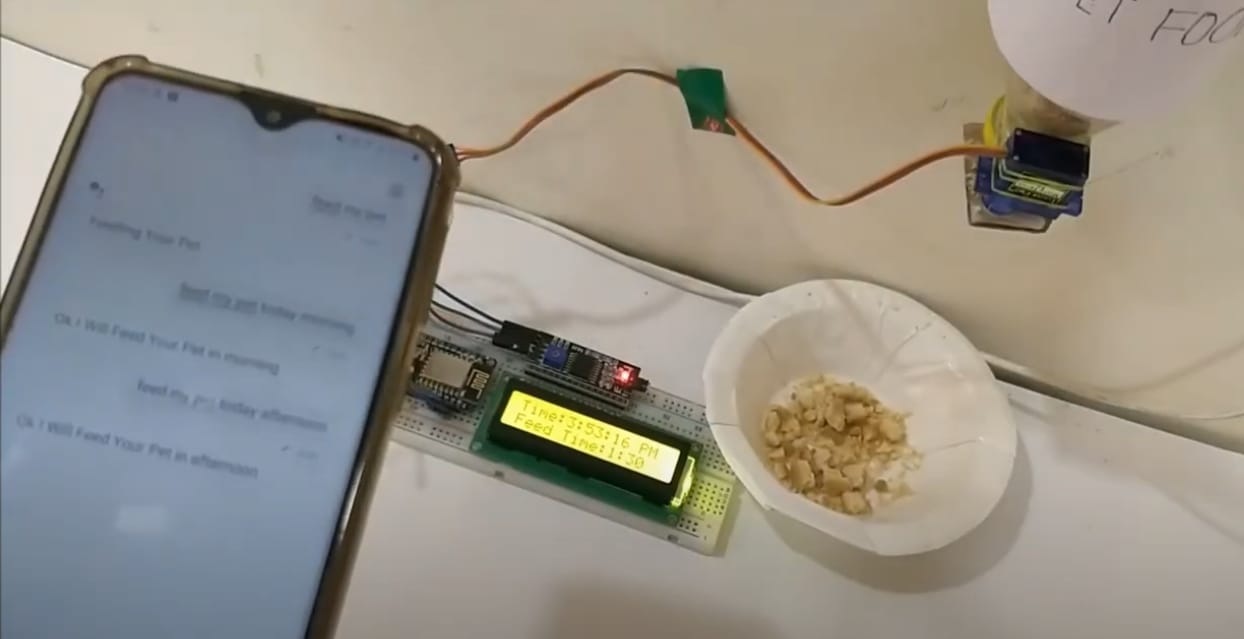 This project employs a NodeMCU ESP8266 as the brain, a Servo motor to handle the feeding bottle, and a nifty 16*2 LCD for displaying the time.