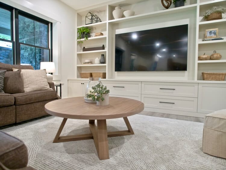 After designing it and laying it all out, I knew it could work. Using some techniques I’ve picked up over the years I was able to make a 46″ round coffee table from a single sheet of plywood and it turned out even better than her or I could have ever expected.