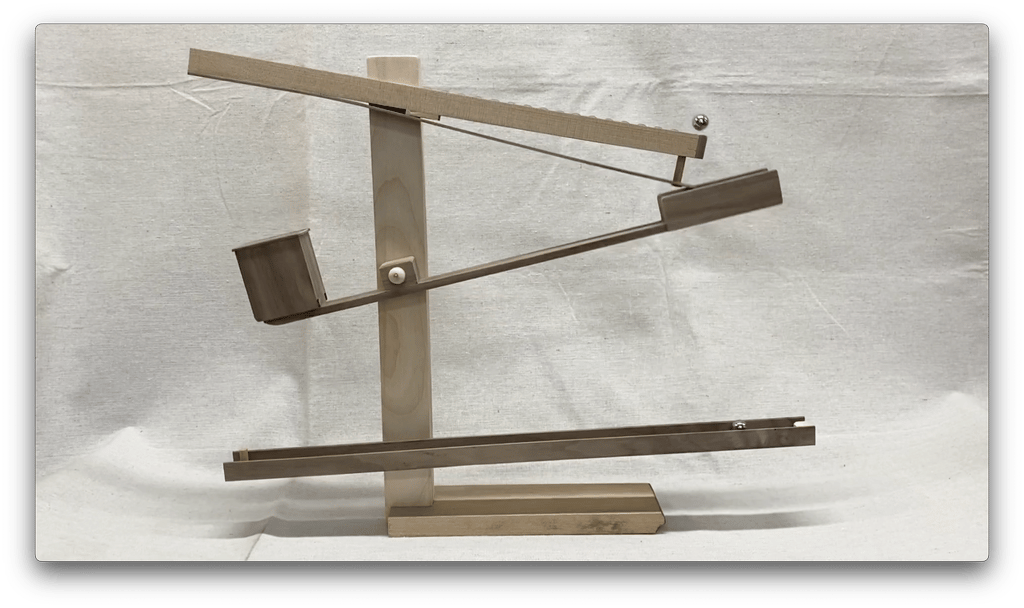 This marble-run escapement releases one steel ball per cycle and is fun to watch and listen to. The middle lever arm pivots up and down.